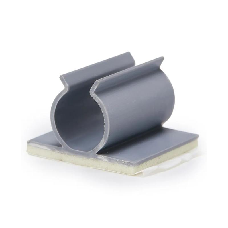 U-shaped adhesive-backed clamp securing cables neatly onto flat surfaces without mechanical fastening.